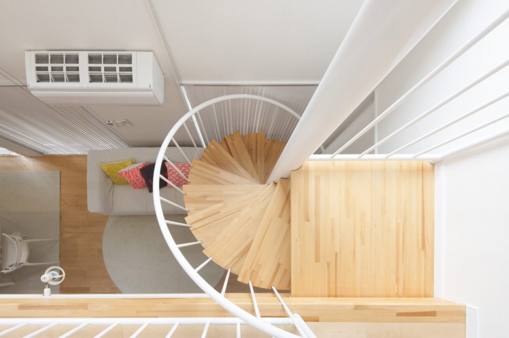 螺旋階段をリビングに配し、吹抜空間により明るくて開放的なプランとなっています。